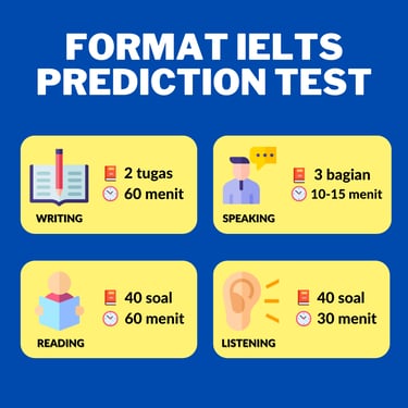 Online ELTS Prediction Test adalah simulasi online seperti mengikuti official IELTS Test untuk mengetahui berapa initial score IELTS kamu di tiap skill yang berbasi platform web, yang bisa dikerjakan kapan pun dan di mana pun.